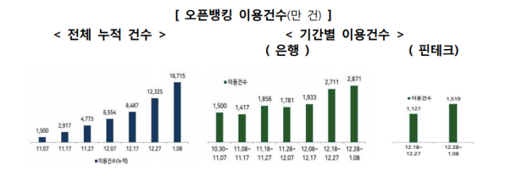 지난해 12월 전면 시행된 오픈뱅킹 서비스가 누적 가입자 수 1200만 명을 돌파하고, 하루 평균 374만 건의 이용건수를 기록하는 등 서비스 시행 초반부터 흥행 가도를 이어가고 있습니다.