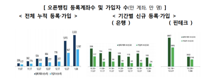 금융위원회에 따르면 오픈뱅킹이 시범 운영된 지난해 10월 30일부터 지난 1월 8일까지 약 2개월 여 동안 약 1197만 명이 오픈뱅킹 서비스를 통해 2222만 계좌(중복가입 가능)를 등록했다고 밝혔습니다. 특히 1월 8일 오픈뱅킹 전면 시행일 이후부터 22일간 일평균 40만 명이 서비스에 신규가입했으며 66만 계좌가 신규 등록돼 가입자수는 567%, 등록계좌 수는 313% 증가한 수치입니다.