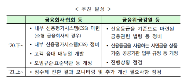 관련 제도 정비를 위해 신용등급을 기준으로 마련된 금융 관련 법령, 서민금융상품, 공공기관 업무규정 등 개정 방안을 마련 중에 있으며 점수제 전환에 따른 대출 승인 여부 등 예측가능성 저해, 대출 거절 시 금융회사의 설명상 어려움 등 금융소비자 불편을 최소화하기 위해 노력하고 있다고 밝혔습니다. 또한 금융위는 전담팀에서 마련한 방안을 바탕으로 신용등급을 기준으로 마련된 금융위·타부처 소관 관련 법령을 개정 중에 있습니다.